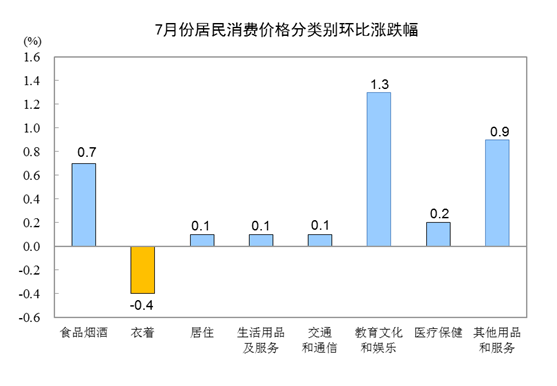 7月份,全國(guó)居民消費(fèi)價(jià)格環(huán)比上漲0.4%。其中,城市上漲0.4%,農(nóng)村上漲0.3%;食品價(jià)格上漲0.9%,非食品價(jià)格上漲0.3%;消費(fèi)品價(jià)格上漲0.2%,服務(wù)價(jià)格上漲0.7%。
