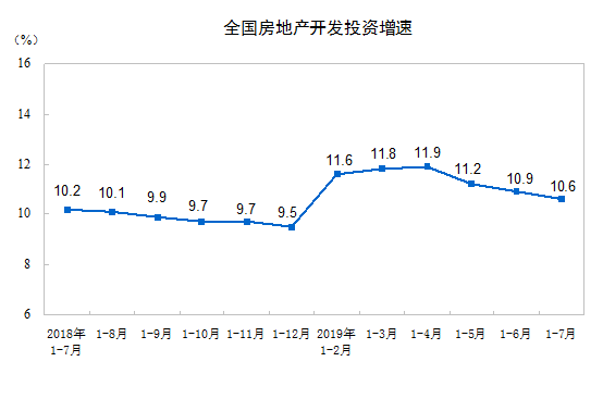2019年1—7月份,全國(guó)房地產(chǎn)開發(fā)投資72843億元,同比增長(zhǎng)10.6%,增速比1—6月份回落0.3個(gè)百分點(diǎn)。其中,住宅投資53466億元,增長(zhǎng)15.1%,增速回落0.7個(gè)百分點(diǎn)。住宅投資占房地產(chǎn)開發(fā)投資的比重為73.4%。