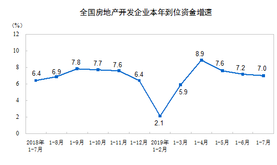 1—7月份,房地產(chǎn)開發(fā)企業(yè)到位資金99800億元,同比增長(zhǎng)7.0%,增速比1—6月份回落0.2個(gè)百分點(diǎn)。其中,國(guó)內(nèi)貸款15377億元,增長(zhǎng)9.5%;利用外資61億元,增長(zhǎng)83.6%;自籌資金31032億元,增長(zhǎng)2.8%;定金及預(yù)收款33980億元,增長(zhǎng)9.6%;個(gè)人按揭貸款15198億元,增長(zhǎng)11.3%。