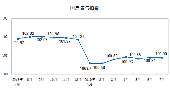 7月份,房地產(chǎn)開發(fā)景氣指數(shù)(簡(jiǎn)稱“國(guó)房景氣指數(shù)”)為100.90,比6月份回落0.01點(diǎn)。