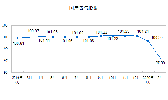 2月份,房地產(chǎn)開發(fā)景氣指數(shù)(簡稱“國房景氣指數(shù)”)為97.39。