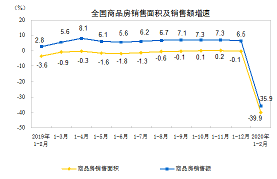 1—2月份,商品房銷售面積8475萬平方米,同比下降39.9%。其中,住宅銷售面積下降39.2%,辦公樓銷售面積下降48.4%,商業(yè)營業(yè)用房銷售面積下降46.0%。商品房銷售額8203億元,下降35.9%。其中,住宅銷售額下降34.7%,辦公樓銷售額下降40.6%,商業(yè)營業(yè)用房銷售額下降46.0%。