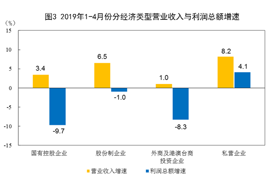 1—4月份,規(guī)模以上工業(yè)企業(yè)中,國(guó)有控股企業(yè)實(shí)現(xiàn)利潤(rùn)總額5704.3億元,同比下降9.7%;股份制企業(yè)實(shí)現(xiàn)利潤(rùn)總額12873.3億元,下降1.0%;外商及港澳臺(tái)商投資企業(yè)實(shí)現(xiàn)利潤(rùn)總額4455.2億元,下降8.3%;私營(yíng)企業(yè)實(shí)現(xiàn)利潤(rùn)總額4597.1億元,增長(zhǎng)4.1%。