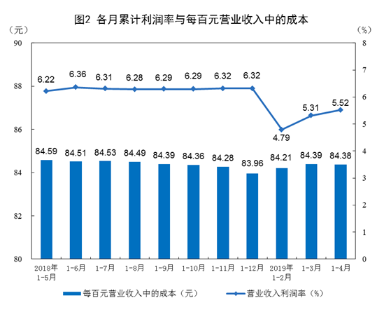 1—4月份,規(guī)模以上工業(yè)企業(yè)實(shí)現(xiàn)營(yíng)業(yè)收入32.84萬(wàn)億元,同比增長(zhǎng)5.1%;發(fā)生營(yíng)業(yè)成本27.71萬(wàn)億元,增長(zhǎng)5.3%;營(yíng)業(yè)收入利潤(rùn)率為5.52%,同比降低0.48個(gè)百分點(diǎn)。